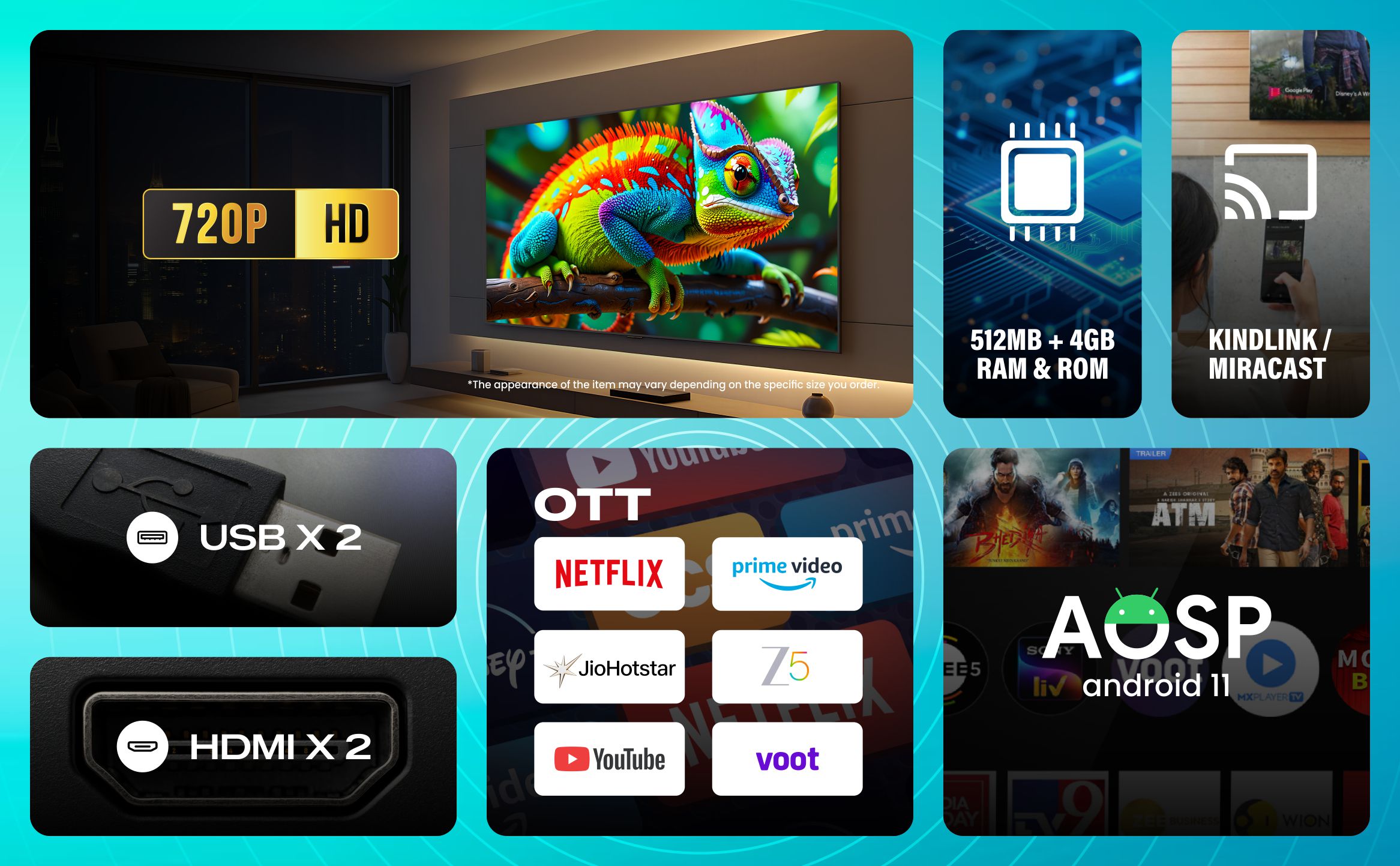 You Tube, Prime Video, Netflix, Jiostar, Kindlink, Miracast